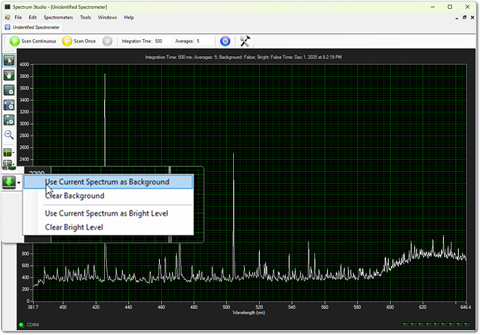 Whenever you change the integration time, capture a new background. Spectrum Studio does not automatically warn you or clear the old background – it will otherwise subtract an incorrect background.
