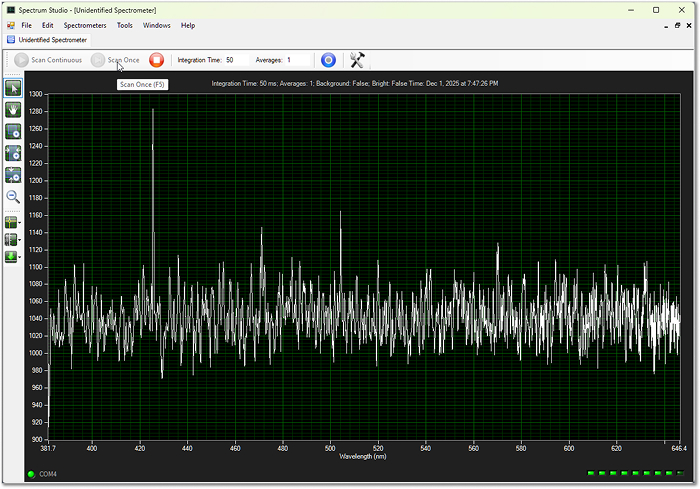 - Start Spectrum Studio with the spectrometer powered and connected.